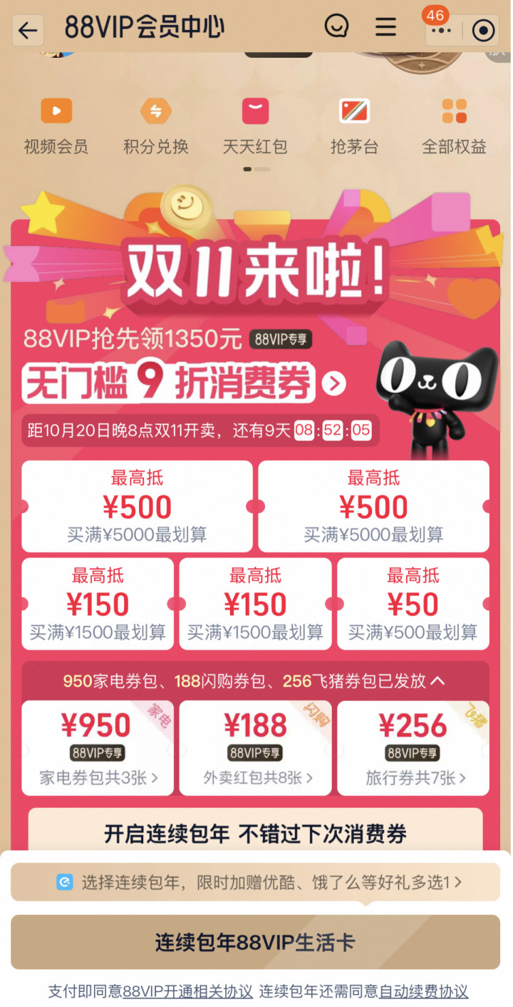 天猫与淘宝则集中采用“官方立减”方式,消费者无需凑单即可享受平台的折扣优惠,即使只购买单件商品。平台88VIP付费用户可抢先领共计1350元的无门槛9折消费券,同时双十一期间还会陆续发放至少5000元消费券。